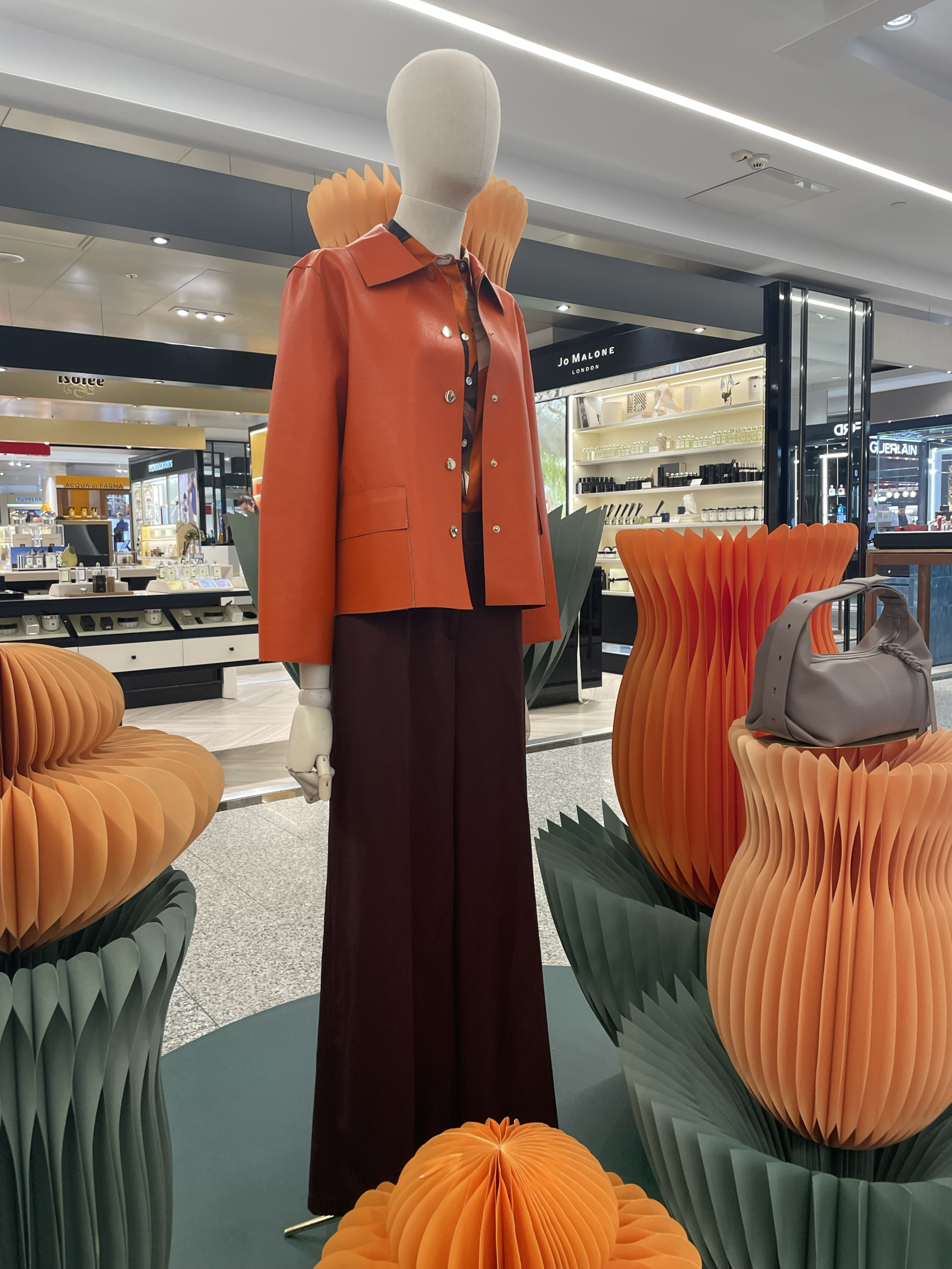 Dans une autre installation, un mannequin portait une veste orange lumineuse associée à un pantalon sobre très fluide. Autour, des structures en papier sculptural formaient un décor organique, presque végétal.